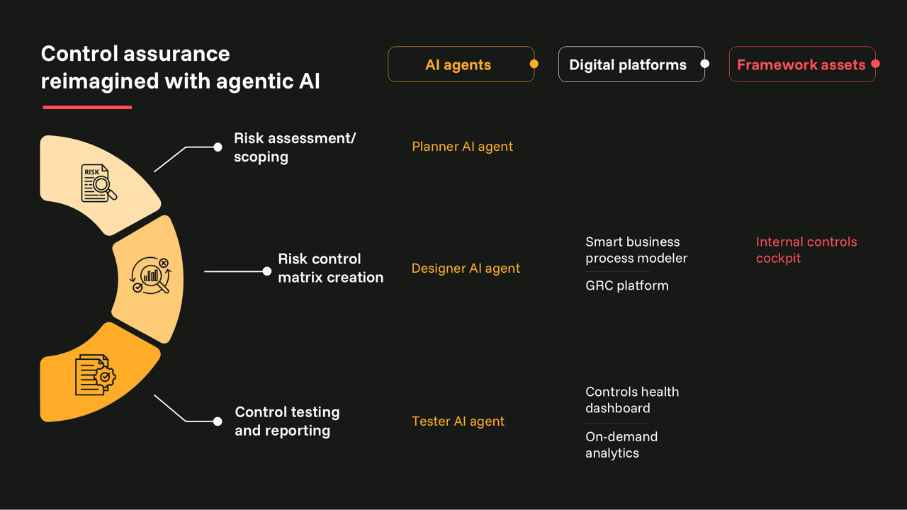 These three AI agents work in tandem with each other, supported by tailored digital frameworks and governance, risk, and compliance platforms, to enable efficient, continuous monitoring.