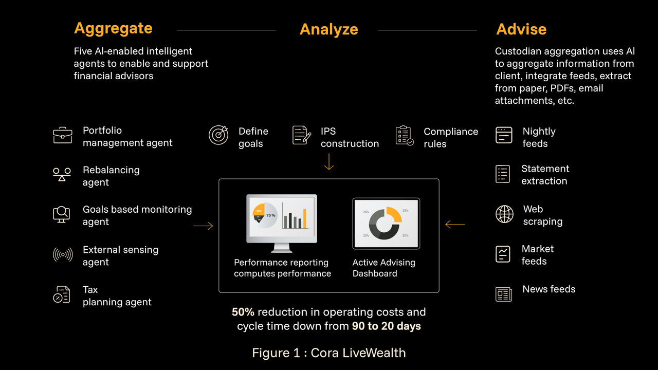 Management firms can enhance client experiences economically and efficiently with Cora LiveWealth – all without disrupting their existing IT infrastructure. Our solution utilizes AI-driven agents to improve wealth and asset management processes, helping financial advisors develop growth-focused strategies for their clients more quickly.